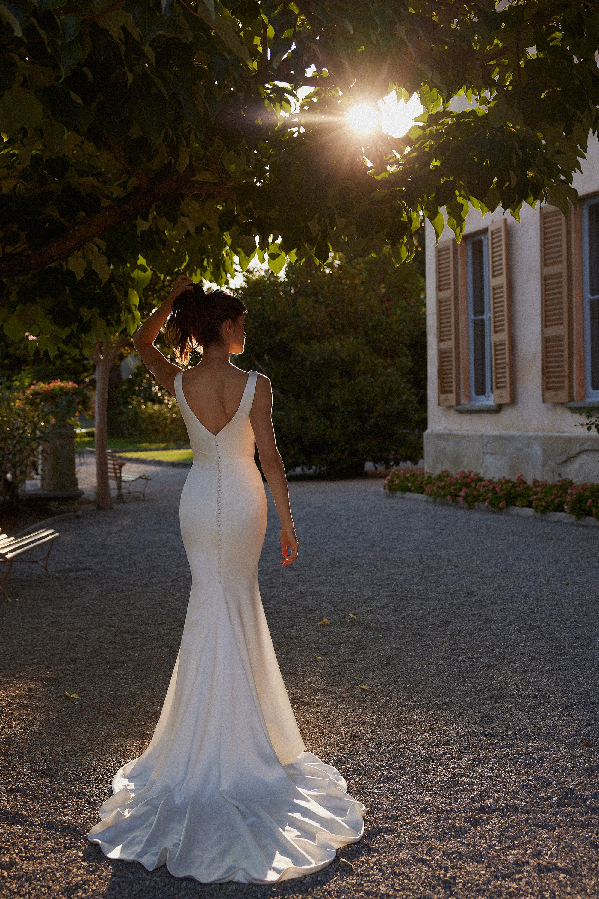 This stunning satin charmeuse v-neckline gown features a ruched bodice and soft-fitted skirt, finished with a chapel length train and buttons