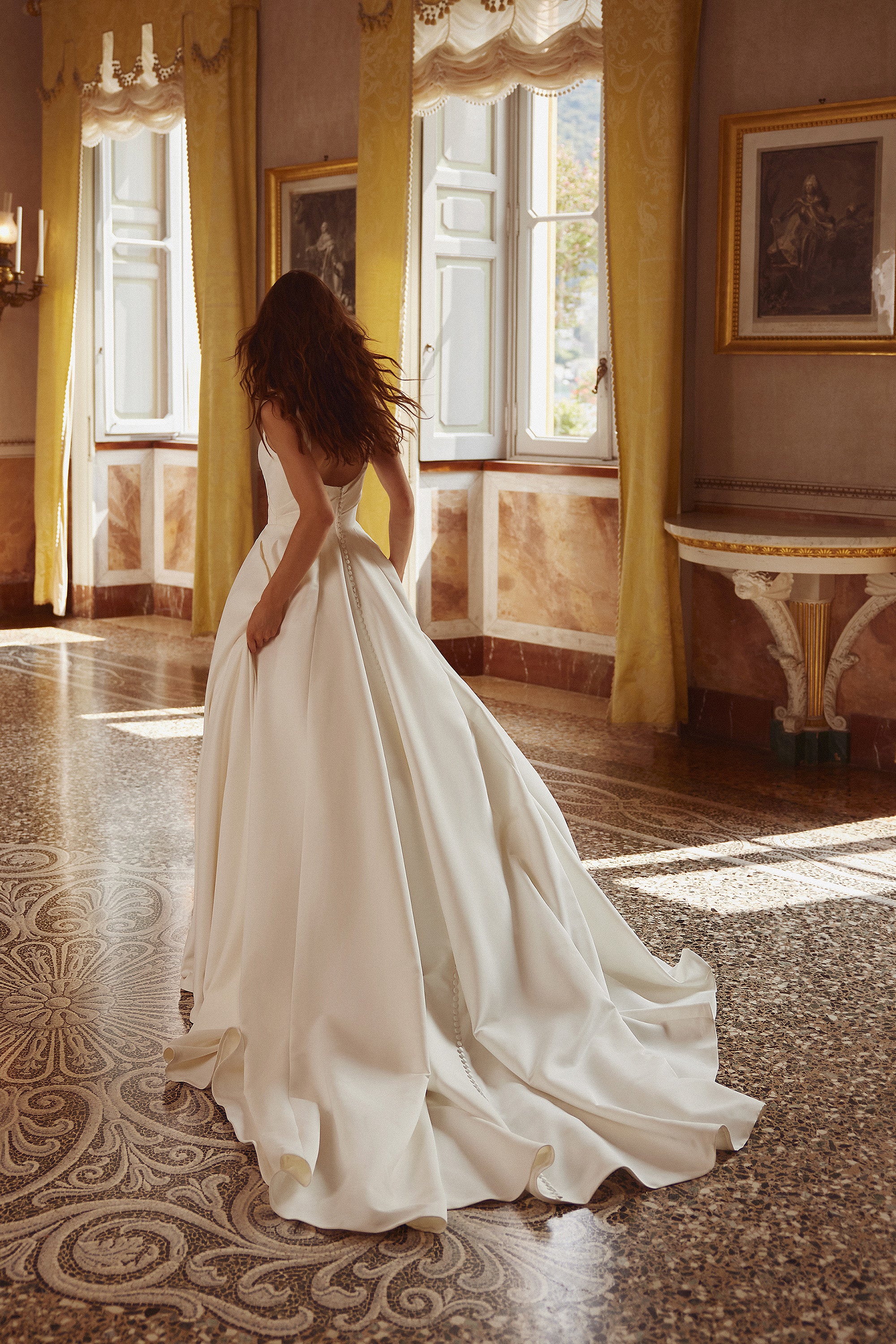 This classic satin ball gown features asymmetric pleated bodice with a square neckline that transitions into a clean, simple, skirt accented with buttons down the train
